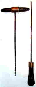 left, is a gunner's gimlet. A wood handled small gimlet is angled