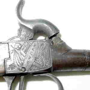 This small side hammer percussion pistol measures 5-1/8" overall.