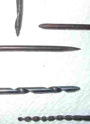 left, is a gunner's gimlet. A wood handled small gimlet is angled